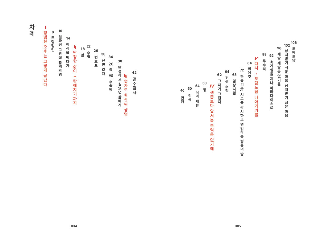 72페이지부터 83페이지에 해당하는 ‘판옵티콘’ 챕터는 작가의 실제 일기를 가감 없이 옮겨둔 구성으로, 백색지가 아닌 강렬한 붉은 색지를 전면에 활용했습니다. 작가가 일기에 담아낸 고통과 상처가 마치 ‘피눈물로 써 내려간 기록’과도 같다는 점을 상징적으로 표현하기 위함입니다.